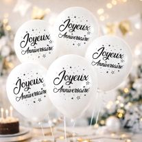 Couleur principale : Noir avec des motifs colorés "Joyeux Anniversaire"
