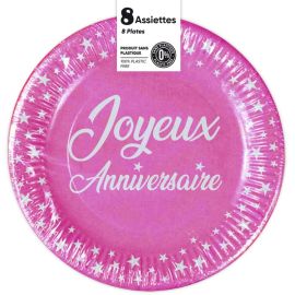 8 Assiettes rondes Joyeux anniversaire Fuschia 23 cm en carton