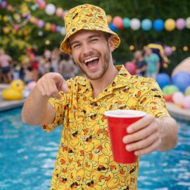 Ajoutez une dose massive de fun à votre tenue avec ce bob déguisement canards pas cher, l’accessoire idéal pour un look décalé, humoristique et totalement assumé. Avec son imprimé jaune vif rempli de petits canards rigolos, certains affublés de lunettes de soleil, ce bob attire immédiatement l’attention et donne le ton : ici, on est là pour s’amuser.