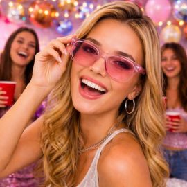 Éléments visuels : paillettes roses, boucle brillante avec strass