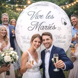 Style chic et festif : L’inscription "Vive les mariés" ajoute une touche romantique et joyeuse.