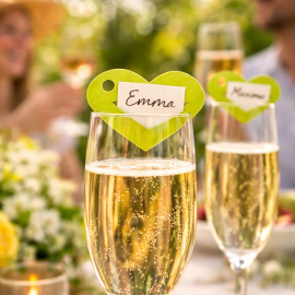 A fixer sur vos assiettes, verres, ou serviettes, écrivez le nom de vos convives sur le coeur métal !