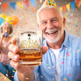 La retraite, c’est enfin le début d’une nouvelle vie où l’on peut trinquer sans stress ! Offrez un cadeau humoristique et élégant avec ce coffret cadeau verre à vin "Vive la Retraite". Avec son design raffiné et son message amusant "La Cuvée Libre", il symbolise à merveille cette nouvelle étape synonyme de détente et de liberté.