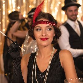 Ce déguisement femme à l'effigie de l'époque Charleston est vendu avec une robe, une coiffe et des mitaines.