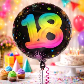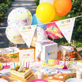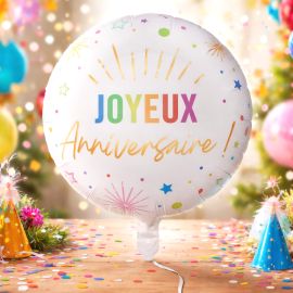 Design : Motifs colorés avec feux d’artifice, étoiles et inscription “Joyeux Anniversaire”.