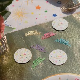 Design : Motifs colorés avec feux d’artifice, étoiles et inscription “Joyeux Anniversaire”.