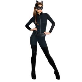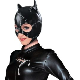 Le costume est complété par une paire de manchons avec détails 3D, des couvre-bottes noirs effet cuir et un masque/loup noir à oreilles pointues, pour un look complet et prêt à sauver la ville (avec style).