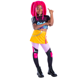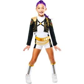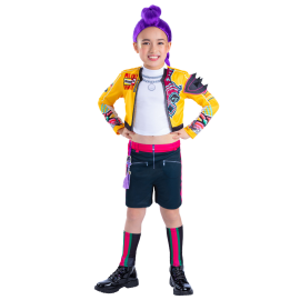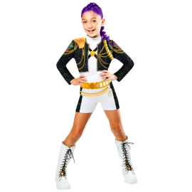 L’ensemble se compose d’une veste noire brillante au style moderne, d’un t-shirt blanc et d’une jupe assortie aux finitions dorées, pour un look tendance et audacieux. La perruque violette (si utilisée en accessoire) accentue l’effet scène et donne une vraie personnalité à la tenue. Facile à enfiler et agréable à porter, ce déguisement fille pas cher disponible sur Badaboum.fr combine style, confort et excellent rapport qualité-prix pour faire briller votre enfant sous les projecteurs.