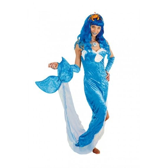 Le Déguisement Femme Ondine Bleu taille M comprend magnifique robe de sirène bleue, en velours, se terminant par une traîne en queue de poisson. Les gants sont assortis à la robe. Les accessoires ne sont pas inclus.