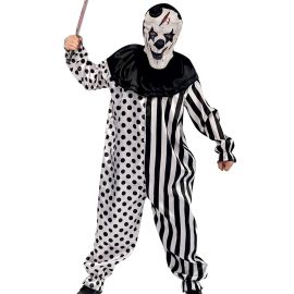 Avec son design noir et blanc en motifs rayés et à pois, ce costume apporte une touche de folie inquiétante. Son masque intégral sinistre, orné d’un sourire démoniaque et de fausses blessures, complète à la perfection l’apparence macabre de cet arlequin maudit.