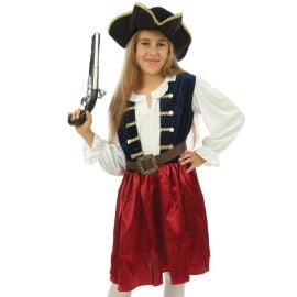 Le déguisement comprend une chemise imprimée camouflage avec effet déchiré, un gilet noir intégré, un pantalon noir à ourlets dentelés et une ceinture grise avec effet usé. Le chapeau de pirate orné d’un crâne et de détails verts délavés apporte la touche finale, transformant votre enfant en pirate des mers maudit.