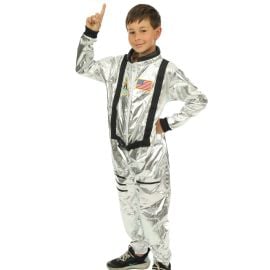 Combinaison argentée complète : Avec des détails réalistes tels que des écussons de mission spatiale et un design futuriste.