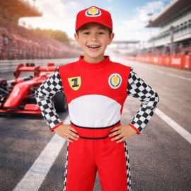 La combinaison rouge au style racing, associée à ses motifs damier noirs et blancs et à la casquette assortie, offre un rendu visuel fort et réaliste. Confortable et facile à enfiler, ce déguisement enfant pas cher est idéal pour le carnaval, un anniversaire, une fête à thème ou tout simplement pour jouer à la maison. Disponible sur Badaboum.fr, il allie look sportif, praticité et excellent rapport qualité-prix pour des heures de plaisir sur la ligne de départ.