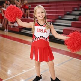 Éléments visuels : inscription USA, coupe évasée, style cheerleader