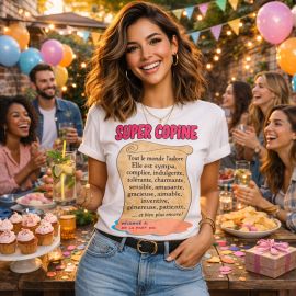 - Couleur : Blanc avec bordure dorée et inscription bleue "Super Copine"