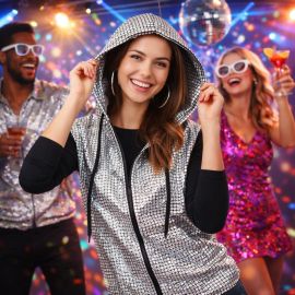 Facile à porter, ce gilet disco argent pour déguisement se superpose aisément sur un haut noir pour un contraste élégant et percutant. La capuche apporte une touche tendance et décontractée, idéale pour se démarquer tout en restant à l’aise toute la soirée. Disponible sur Badaboum.fr, ce gilet offre un excellent rapport qualité-prix, parfait pour celles et ceux qui veulent un déguisement pas cher mais spectaculaire.
