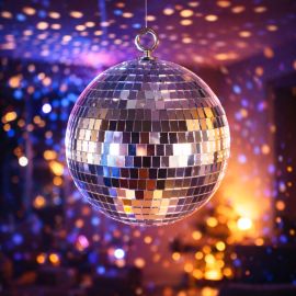 Design disco rétro avec boule à facettes et fond noir scintillant