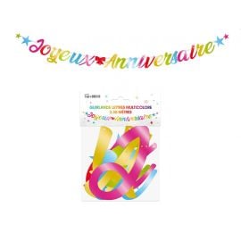 Guirlande fil joyeux anniversaire metallique multicolore, choisissez cette guirlande de 10 mètres comprenant des minis fanions pailletés et hologrammes Joyeux anniversaire surmontés d'un fil transparent.