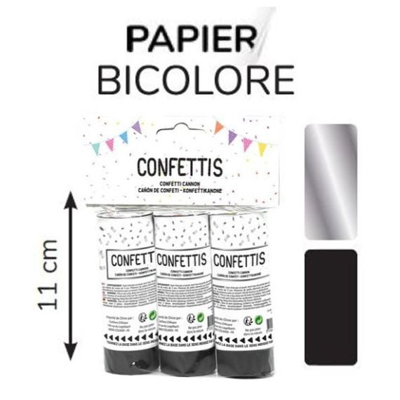 Lot de 3 canons à confettis noir et Argent 11cm papier de soie