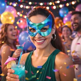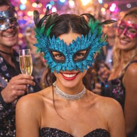 Sequins Brillants : Décoré de sequins scintillants en bleu et turquoise, ce masque attire tous les regards.