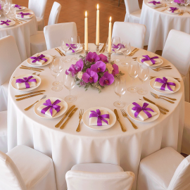 La nappe ronde 230cm est une nappe de table en 100% Polyester haut de gamme idéale pour traiteurs et organisateurs de mariage