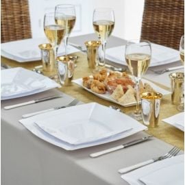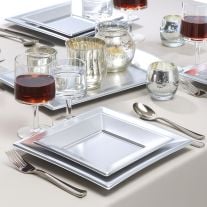 Le Petit saladier plastique avec liseré Argent 14cm est proposé en lot de 4 à prix économique pour votre cérémonie a accordé avec nos assiettes en plastique prestige et le grand saladier