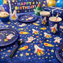 Thème Espace avec des designs ludiques : fusée, astronaute, ballons, lune, étoile et soucoupe volante.