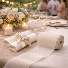 Ce Ruban de decoration en jute naturel 5cm s'utilisera pour vos décorations de tables de fête : mariage, baptême, communion...