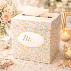 Conçue pour être aussi esthétique que pratique, cette urne de mariage est dotée d’un couvercle amovible festonné et d’une fente discrète sur le dessus, facilitant le dépôt des enveloppes tout au long de l’événement. Son style romantique et intemporel s’intègre parfaitement à une décoration classique chic, romantique, vintage ou fleurie, tout en apportant une vraie touche d’émotion à votre scénographie.